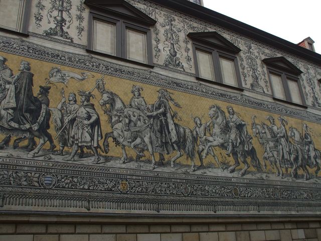 オペラ座、手前はザクセン王ヨハンの騎馬像 ツインガー宮殿内の磁器収集室のマイセンの磁器 歴代君主馬上行進図、マイセン製磁器のモザイク、ザクセン国を支配したべツテイン家出の君主連が描かれている