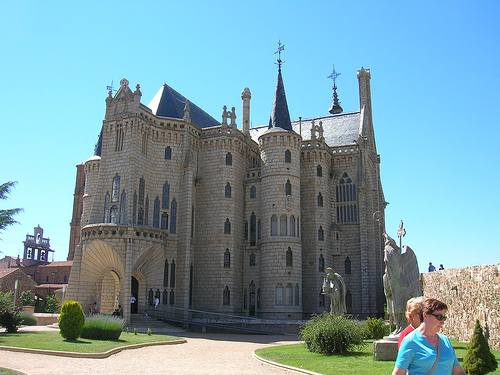 Gaudiの作品もうひとつ なんと荒涼とした景色が永遠と続くのであろうか,そんな印象を長い間持っていた。今から30年ほど前ヒッチハイクで新婚旅行に出かけた二日目、なかなか車が捕まらないし、雨もパラついてきたので仕方ない今日はここに泊るかと決めたのがアストルガだった。町の名前も存在も知らなかった。散歩していて偶然この司教館に出くわした時は言葉を失った。何だ、何だ、これは、丸でGaudiじゃないか。古びた板に直接書かれた説明書を見るとやはりGaudi作と書いてある。うらびれたロマネスクの教会だけが、この荒涼、索漠としたCastillaの大地に存在感と、か細い生命力を与えていると、勝手に思っていただけに。期待を裏切られたような、逆にとんでもない財宝を見つけたようなおかしな気分だった。今回30年ぶりに訪れて町の変貌ぶりには驚いた。近代的な建物も多くできていたし、活気もあった。派手な色の観光バスと派手な服装の観光客が多かったせいだろう。30年前観光客らしきものは一人としてみなかった。それどころか人の動きのない死んだような町だった。ロバに農機具を積んだ農夫をなぜか思い出すし、それが私のアストルガのイメージなっていたのかも知れん。 gordo PR